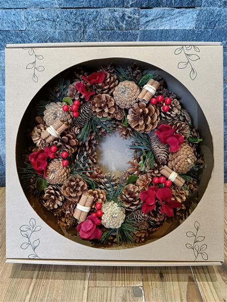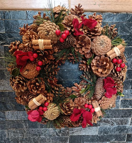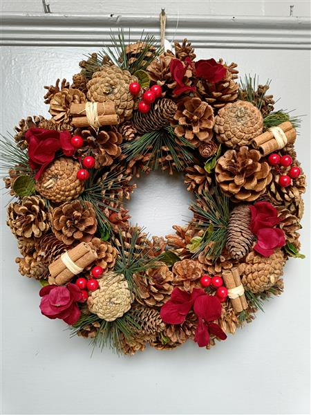 This wreath has a mix of natural pine cones with artificial flowers, berries and greenery in classic reds and greens.