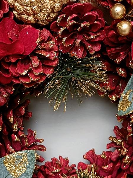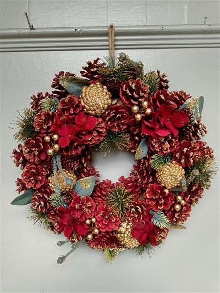 This wreath has a selection of pine cones with artificial flowers, berries and greenery in glittery reds and golds.