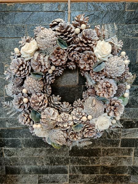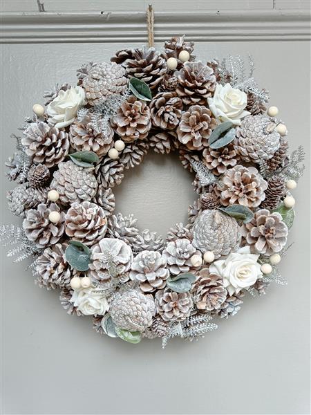 This wreath has a mix of natural pine cones and dried greenery, with artificial roses and berries in frosted white.