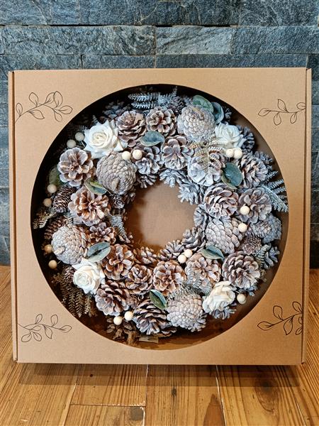 Over 30cm diameter. As the wreath isn't made with fresh flowers/greenery it can be reused for future decoration! Cardboard storage box included while supplies last.